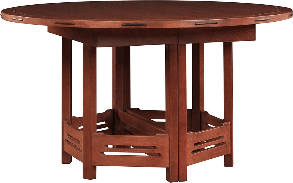 The Thorsen Round Dining Table was inspired by the furnishings at the Thorsen House in Berkeley, built by the Greene brothers in 1909. Decorative African Blackwood pegs and pinned mortise and tenon joinery complete the look of this table that can extend to 100 in length with the addition of two 20 leaves. Available in cherry solids and veneers.