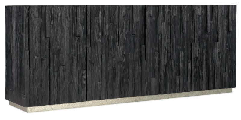Pine Veneers in a Charred Black finish featuring a Japanese technique to achieve the look of burnt wood create a truly unique piece in the Chapman Entertainment Console. Modern yet warm, and up-to-date while employing an ancient technique, this entertainment center is focal-point worthy while offering 4 doors with soft-close hinges and touch latches, 2 adjustable wood shelves behind each pair of doors, a ventilated back panel and a power supply. Accommodates up to an 80-inch TV.
