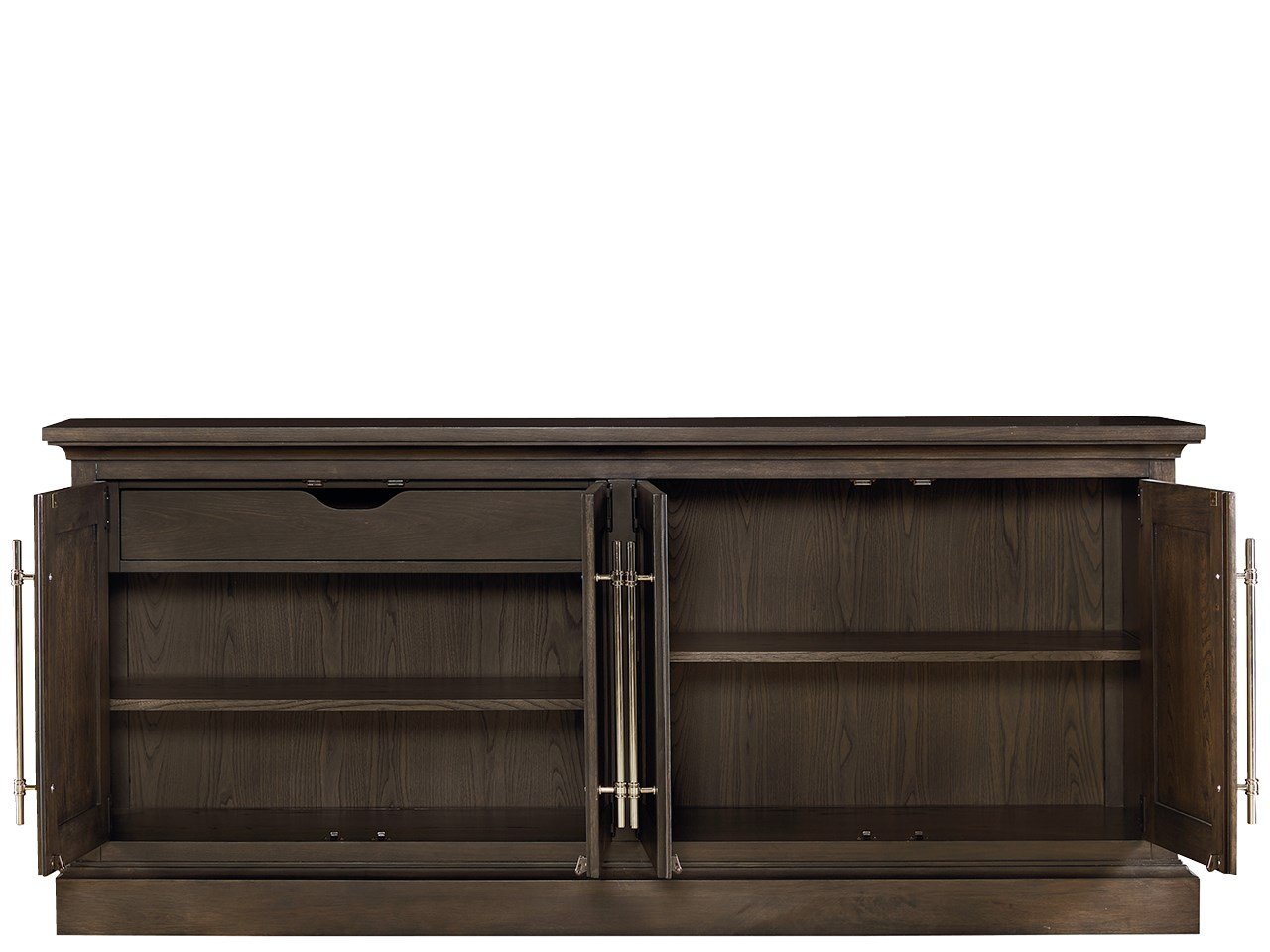 A confident Graphite finish and glossy silver hardware encase an abundance of storage features in the Emerson Console, a smartly versatile living room or home office accent.