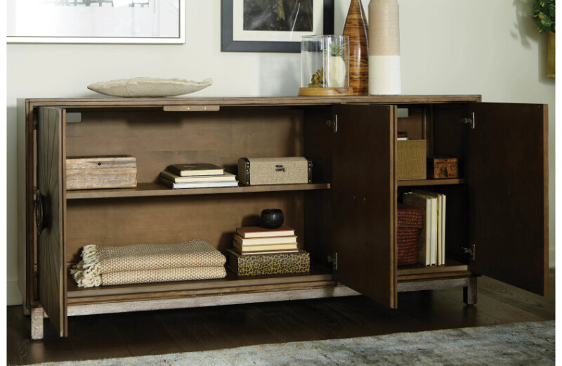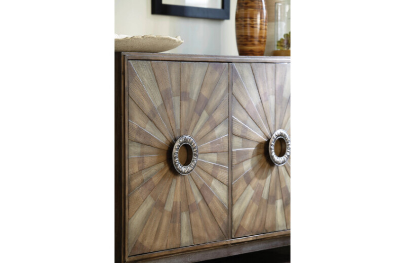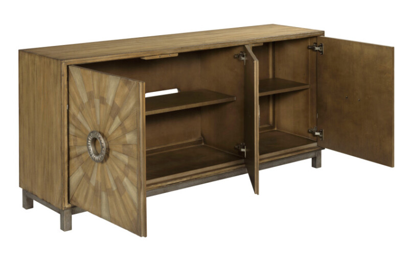 Both understated and intricate, the Astor Entertainment Console uses clean lines with a unique starburst motif in its three doors. This detailed design element is made with carefully selected veneers that use varying thicknesses to create the design. A final touch is completed with the use of large decorative hardware that doubles as a pull.