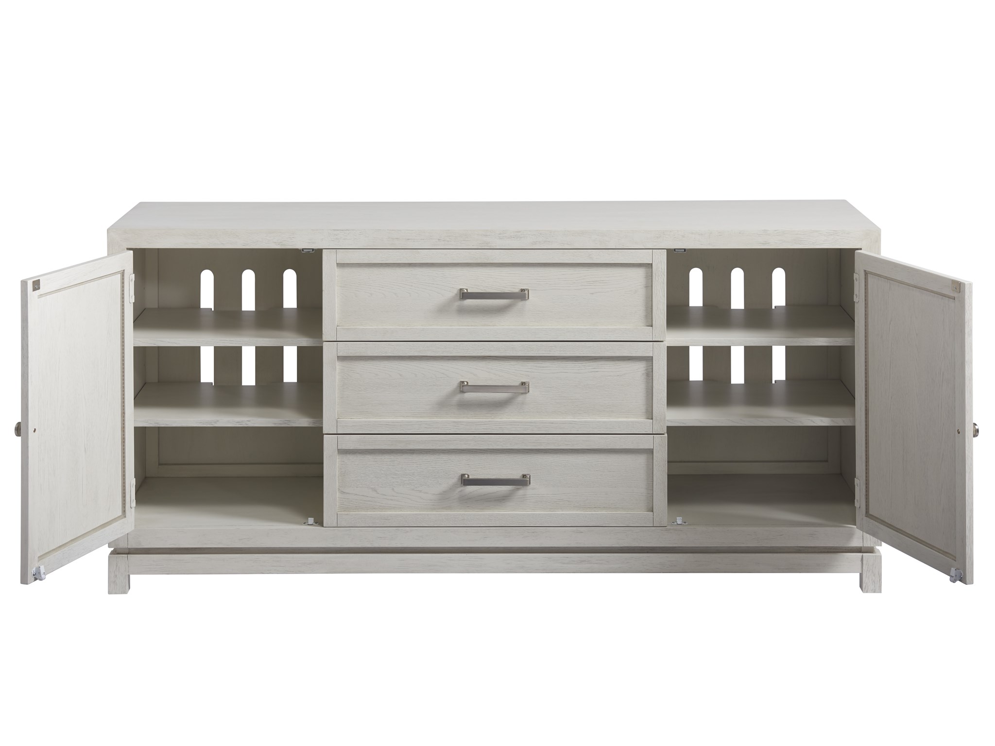 Outfitted with maximum shelving space within a gorgeously light silhouette, the Escape Entertainment Console marries the beauty of casual elegance with functionality, crafted with four shelves and three storage drawers.