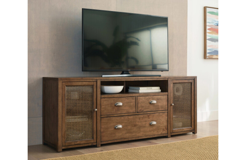 This casual styled entertainment console complements any decor. It is constructed of Alder veneers and select hardwoods with two doors crafted with cane fronts that open to reveal two adjustable wood shelves. This piece provides wire management, hand holds in back of case, and adjustable levelers.