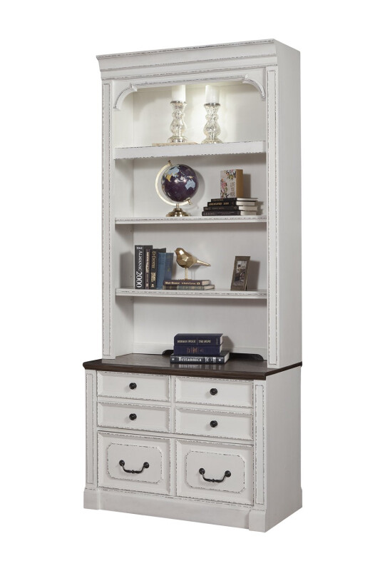 Stylish in every way, this two-drawer lateral file and hutch ensemble from the Provence collections is a home office superstar. You’ll love its weathered Vintage Alabaster finish and updated traditional styling.