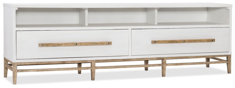 Rustic luxe and sleek, the Urban Elevation Low Entertainment Center has a White Plaster finish on Maple and White Oak Veneers, a cool contrast to the maple base and long bar pulls accented by rustic bolts. There are two drawers and a removable back panel, and media openings in the center and on the left and right sides. A channel speaker opening with two dividers. Accommodates up to an 80-inch TV.