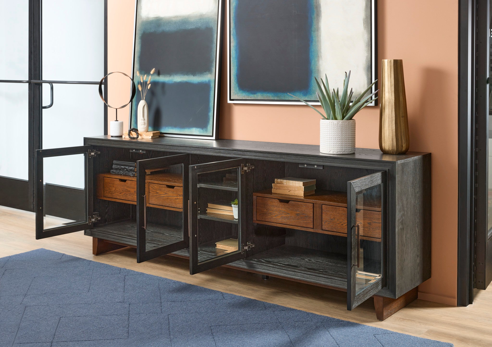 Add effortless style and architectural appeal to your living room with the Waterfall large entertainment console. This striking piece features a timeless silhouette defined by clean lines and simple geometric shapes. Meticulously crafted from poplar and rubberwood solids, oak veneers, and a deep ebony finish, this piece is built to be everlasting. The spacious 92” inch top, four storage cabinets with drawers provide ample space for all your entertainment essentials. The graceful namesake waterfall edges give this large entertainment console true elegance.