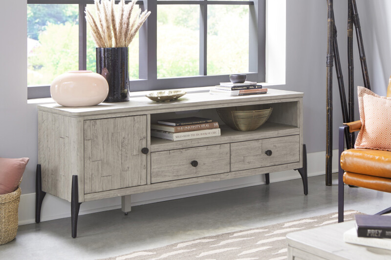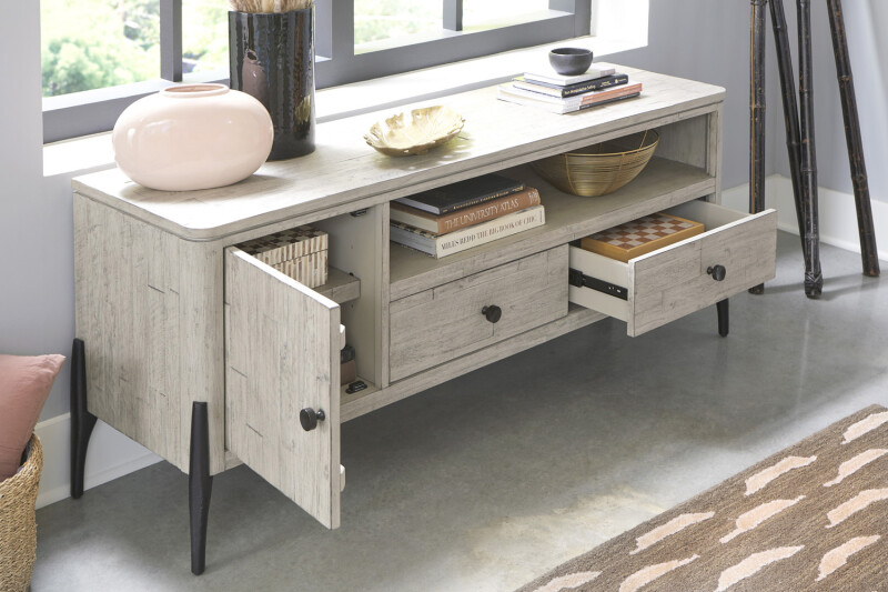 The contrast between the lightly textured parchment finish and matte black metal hardware provides a clean, contemporary look and timeless style.