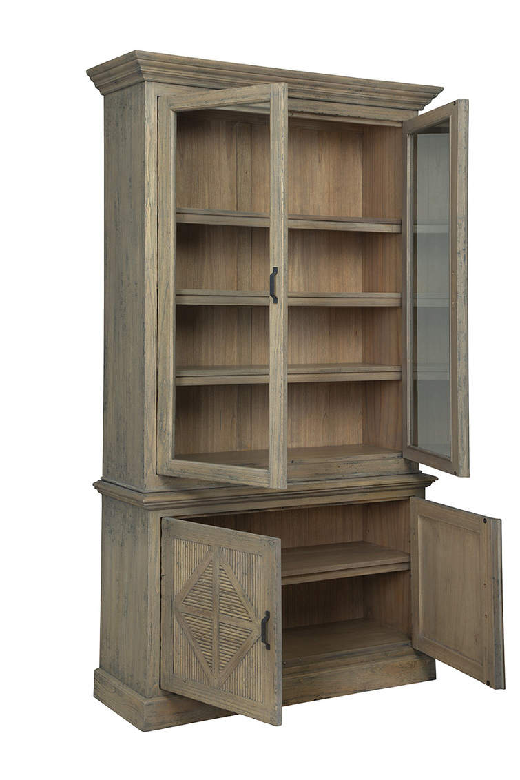 The Blakely Cabinet effortlessly merges classic and modern design elements, making it a good choice for various interior styles. Constructed from solid wood with a neutral grayish-brown finish, this cabinet pairs perfectly with the Blakely Sideboard for a cohesive look. The glass cabinet doors at the top, framed by wood, offer a stylish display option, while the bottom features solid wood doors for discreet storage. Intriguing triangular carvings on the bottom doors add texture and visual interest, complemented by black industrial handles for a contemporary touch.
