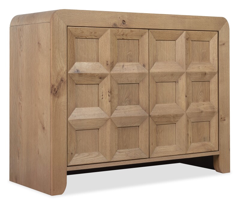 The Haven Accent Chest adds a chic storage solution to any room. Crafted from oak solids and veneers with a medium natural oak finish, this chest features two touch-latch doors with faceted “window pane” fronts for a stylish look. Inside, there’s one adjustable shelf, making it a practical addition to living rooms, bedrooms, or hallways. Its rounded top edges and detailed craftsmanship create a warm and inviting aesthetic.