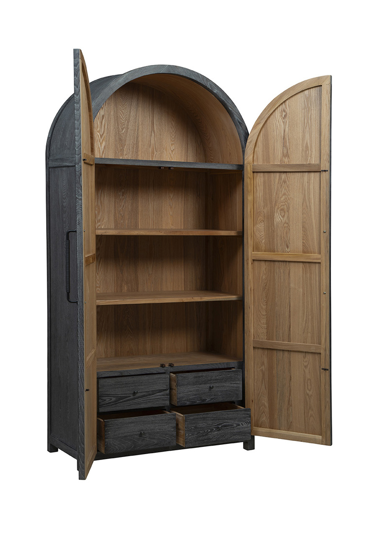 The Eloise Cabinet is a uniquely designed tall dome-shaped cabinet offering generous storage space, featuring three shelves behind its doors and four drawers at the bottom for optimal organization. Crafted from solid wood with a rich deep gray finish, this cabinet gives off a sense of casual elegance. The interior retains its natural wood color, creating a striking contrast with the dark exterior. Standout features include the cabinet doors adorned with a light woven material, adding texture and visual interest to the overall design.