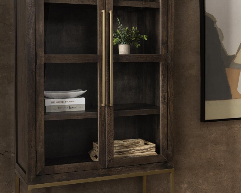 With an intuitive and refined design, the Freemont Tall Cabinet features gracefully proportioned tempered glass doors with elongated metal pulls, seamlessly integrated into its mango wood frame. Elevated on a minimalist metal base, it blends bold structure with airy sophistication.