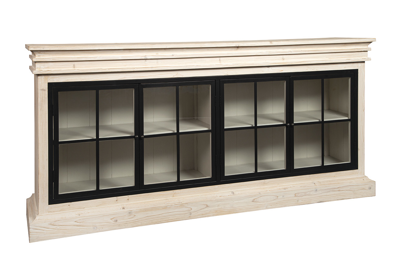 **Final Sale – All Items are sold as is, no returns unless damaged upon receipt. Sporting a slightly exaggerated ogee base and stepped cornice, this arresting pine buffet is made even more eye catching by the contrast of the whitewashed finish and the sleek black metal window pane doors. Behind the doors, there is enough space to display favorite treasures or everyday china. Either way, this buffet is sure to be the star of your room!