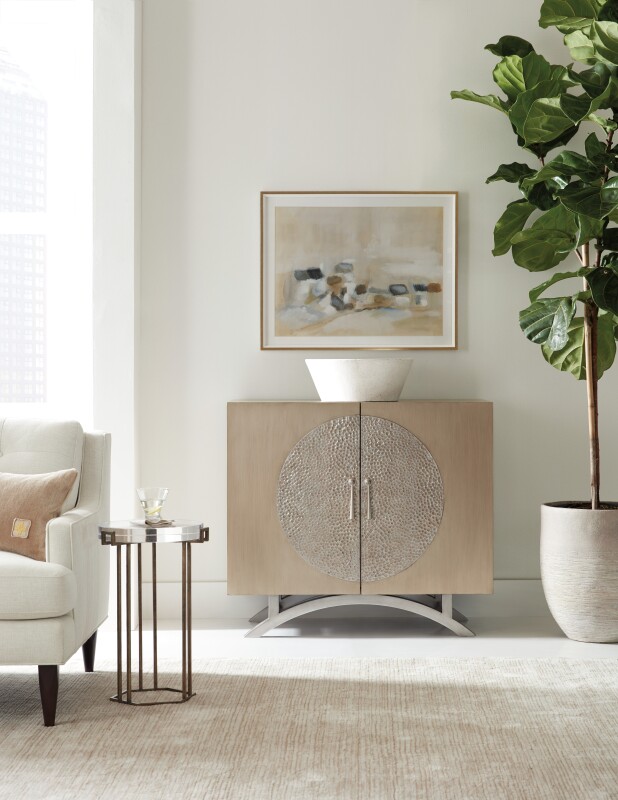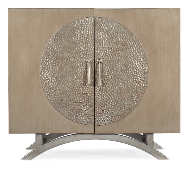 Serene and shimmering in a palette of silver and champagne, the Nolita Two-Door Cabinet is a class act for any space. Crafted of Maple Veneers, resin and metal, the cabinet has a champagne finish with a medallion-like insert and metal teardrop pulls in a pewter finish, along with a pewter base. The two doors have soft-close hinges. The interior is painted gray, and there’s one adjustable shelf and a ventilated back panel.