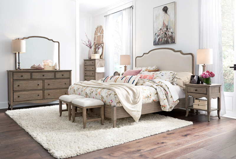 Provence consists of a light, weathered finish on Acacia veneer blending easily with most existing home decor. The gentle curves create a soft, relaxing and livable environment. Custom floral detail knob hardware gives a jolt of excitement turning this classic bedroom into a new classic.