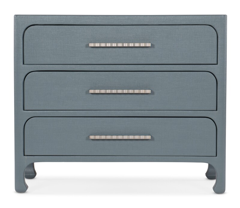 Inspired by casual waterfront living with a chic sophistication, the Cruiser Accent Chest is crafted of Wood and Raffia and finished in Reef Blue, a blue lacquered grasscloth. Chow-style legs and light champagne-colored decorative bar pulls add a designer touch.