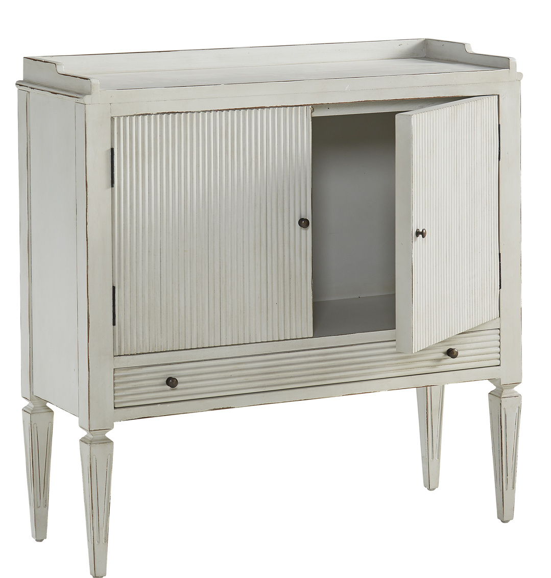 Perched upon finely wrought tapered legs, this charming cabinet captures your attention with it’s unique ribbed detailing on the doors and drawer. The quiet linear nature of this cabinet is enhanced by the light distressing on the edges, revealing the wood beneath the soft cream finish. The same distressing highlights the stepped gallery on the top of this charmer.