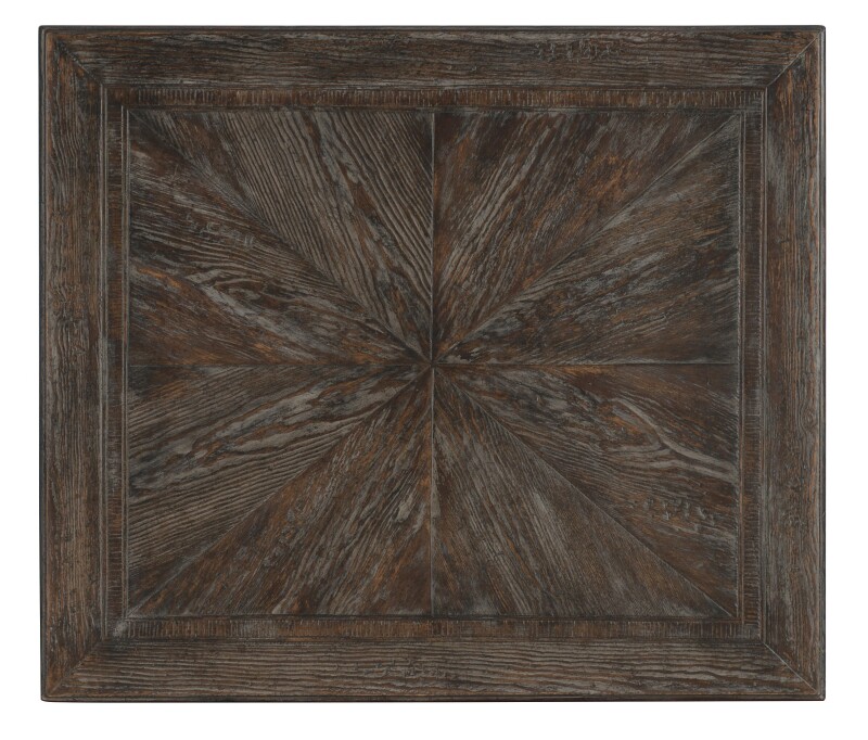 Inspired by European gardens, the Traditions Side Table exudes vintage character with delicately-shaped metal legs and a curved stretcher, contrasting with a Pine and Oak Veneer top with a decorative Maple Inlay. The elegant brown Maduro finish has a grey undertone and distressing for a casual appeal.