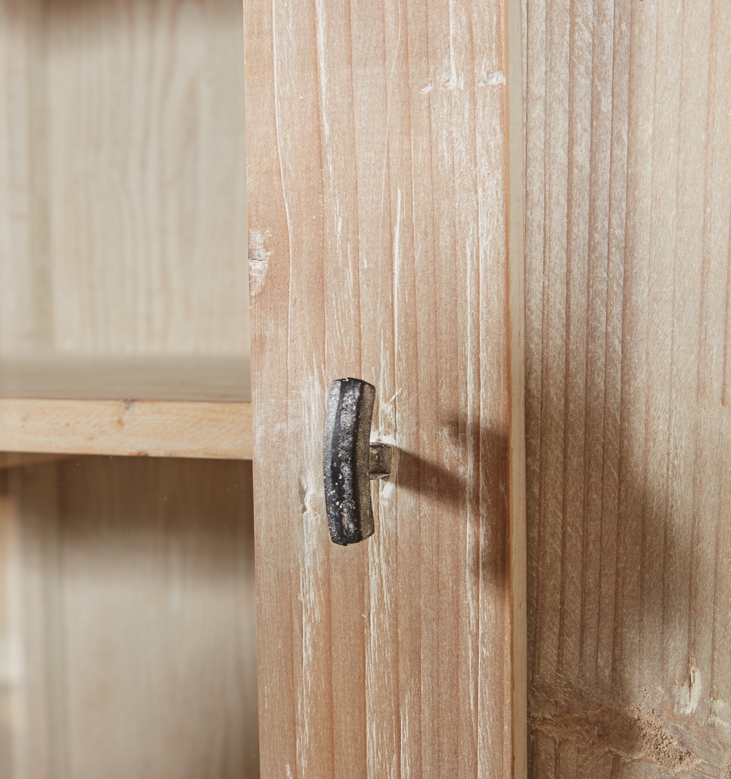 What an amazing piece of cabinetry with architectural detailing! Perfect as the anchor for your gathering room, this handsome piece is crafted of reclaimed pine, with a soft whitewash finish which allows the natural distinctive grain to shine through. There are three fixed shelves behind the tempered glass doors, and in the end cabinets, while the base cabinets have one shelf. Two useful drawers are included in the center cabinet, and are perfect for decks of cards and discarded reading glasses.