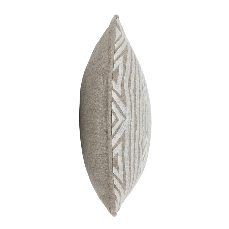 Energetic yet versatile, this pillow features an embroidered tribal design atop a natural-hued background. Understated texture and a subtle sheen add dimension while a piped edge neatly frames the look. Neutral tones complement any color scheme.