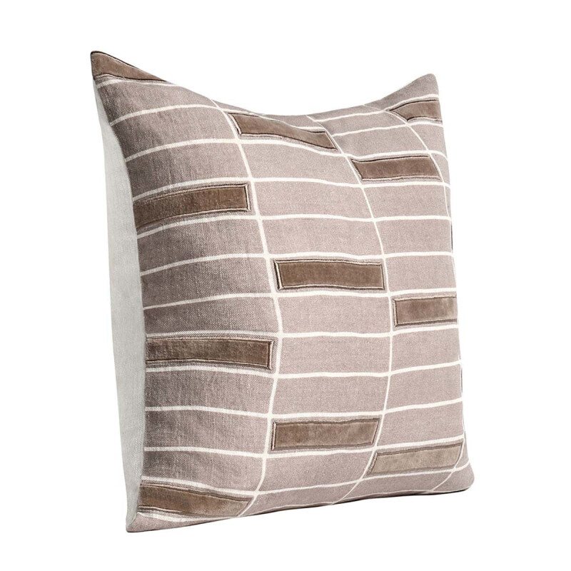 Screen printed by hand, this pillow features a blocky, geometric pattern accented with appliqued velvet and embroidered detailing. Neutral tones give this 100% Belgian flax Linen pillow the versatility to enhance any most color schemes.