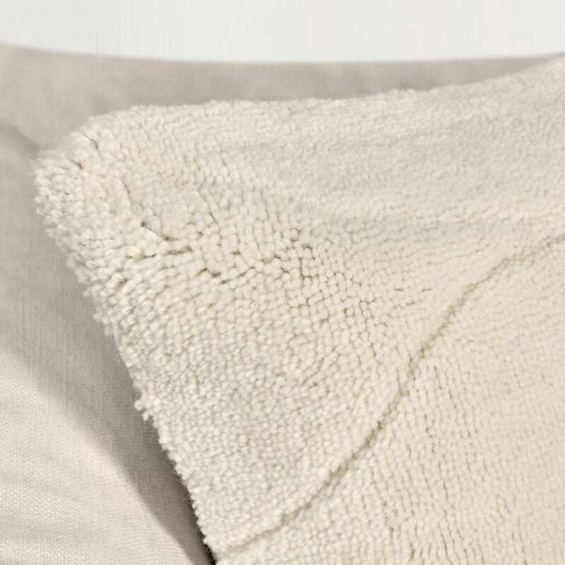 Organic in look and feel, this pillow features New Zealand wool hand-tufted with a touch of soft cotton. The abstract design evokes the imagery and patterns of nature including those found in waves, shells, or sand dunes. Each pillow offers subtle variations in color and texture, making each piece a distinctive accent in any design.