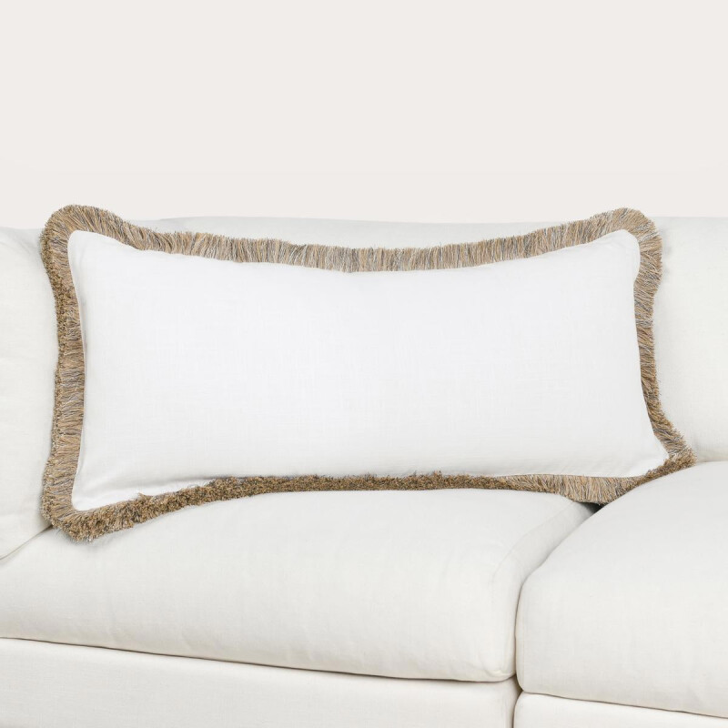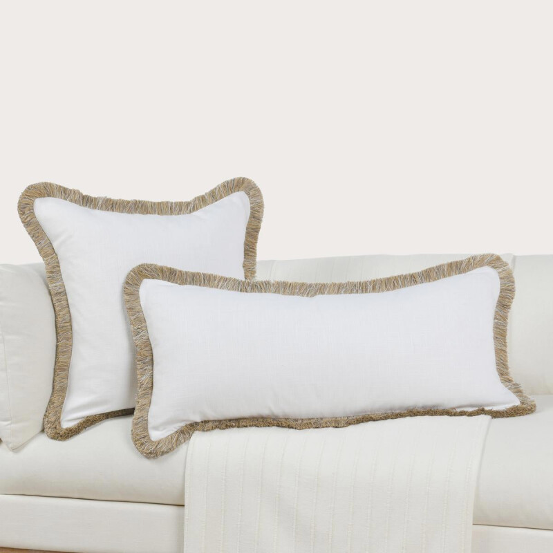 A grounded cotton and linen textured fabric raise the lush texture of fringe around this pillow design. A perfect pillow for layering, a soft feather and down blend insert gives this pillow a lavish supportive feel that makes it as comfortable as it is beautiful.