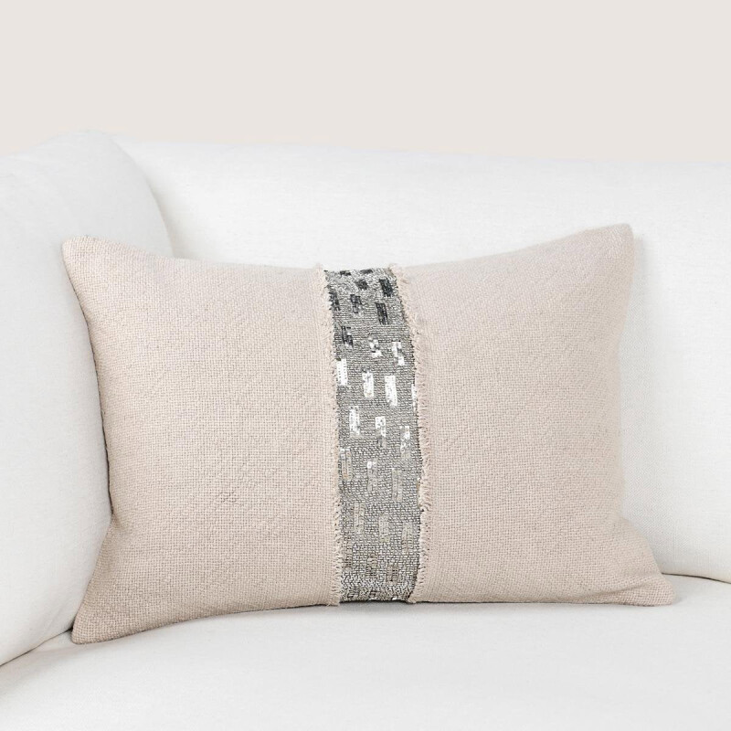 A strong metallic band, rich in beading, this pillow is hand crafted and makes for a declaration of style. A soft feather and down blend insert gives this pillow a lavish supportive feel that makes this pillow beautiful.