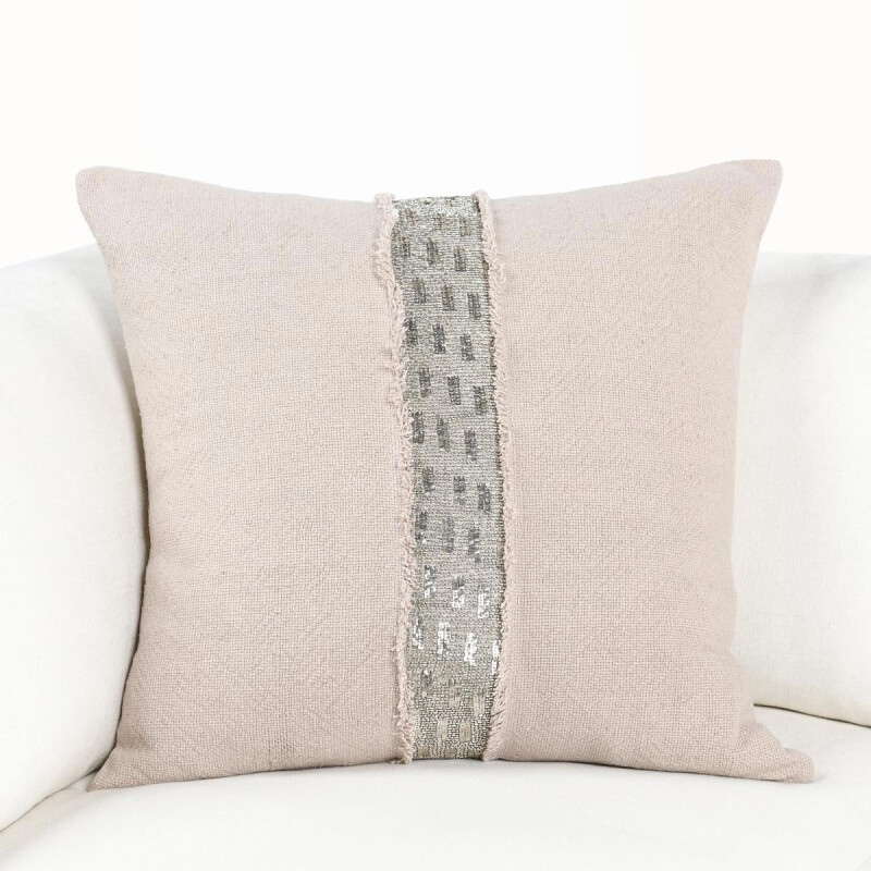 A strong metallic band, rich in beading, this pillow is hand crafted and makes for a declaration of style. A soft feather and down blend insert gives this pillow a lavish supportive feel that makes this pillow beautiful.
