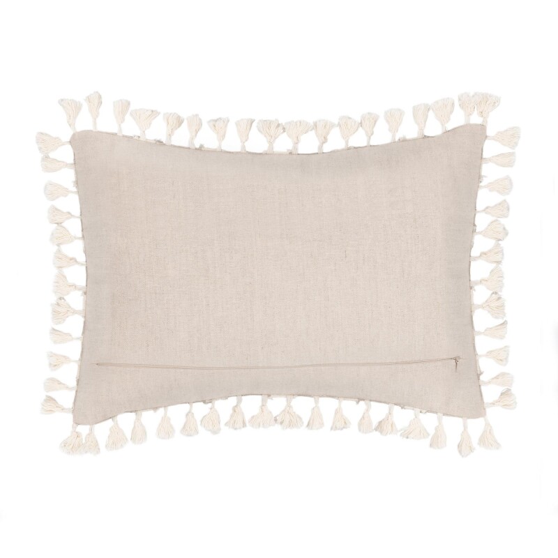 A stripe design in a neutral palette offers versatile style, while hand-applied trim and tassels add a casual, understated warmth. A seamless back zipper and a luxurious feather-and-down fill bring both style and comfort to this plush pillow.