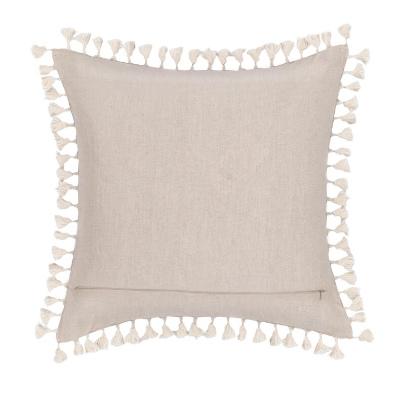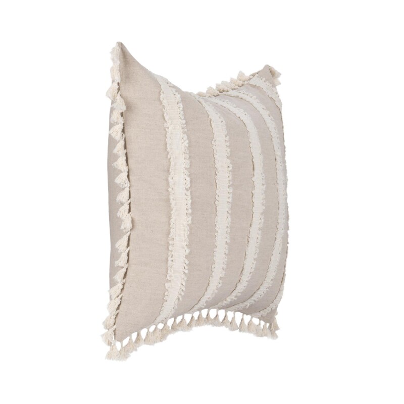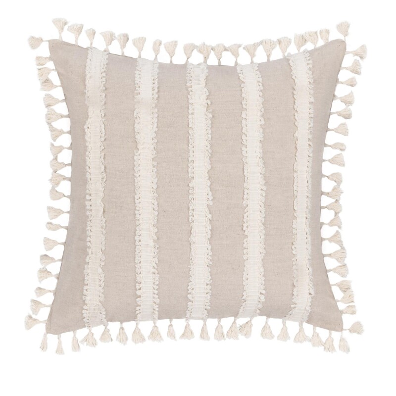 A stripe design in a neutral palette offers versatile style, while hand-applied trim and tassels add a casual, understated warmth. A seamless back zipper and a luxurious feather-and-down fill bring both style and comfort to this plush pillow.