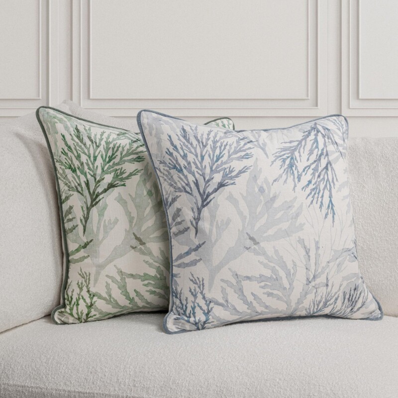 A hand-painted, translucent coral design—rendered in soothing ocean-inspired hues—evokes the feeling of being immersed in a vibrant reef. Printed on sustainably sourced cotton and framed with a velvet trim, this pillow strikes the perfect balance between laid-back charm and statement-making style.
