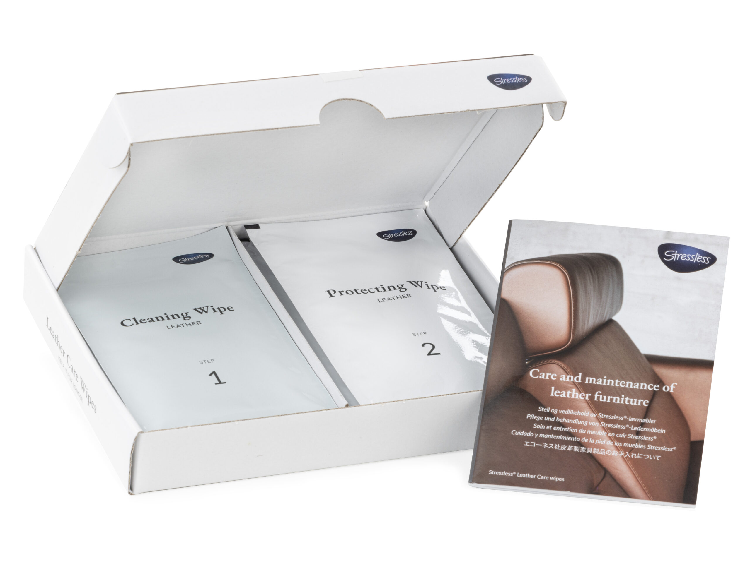 Take care of your furniture – and the furniture will take care of you. The Stressless Leather Care kit (medium, large) contains a leather cleaner and protection solution, and the Stressless Leather Care Wipes contain cleaning wipes and protection wipes. For nurturing, and making the leather more resistant to stains, the protection cream/wipes should be applied to all leather surfaces when your recliner is new. For later treatment, in addition to regularly removing stains, we recommend that the leather is cleaned with the Stressless Leather Cleaner at least every 6 months. Always apply protection cream after cleaning.