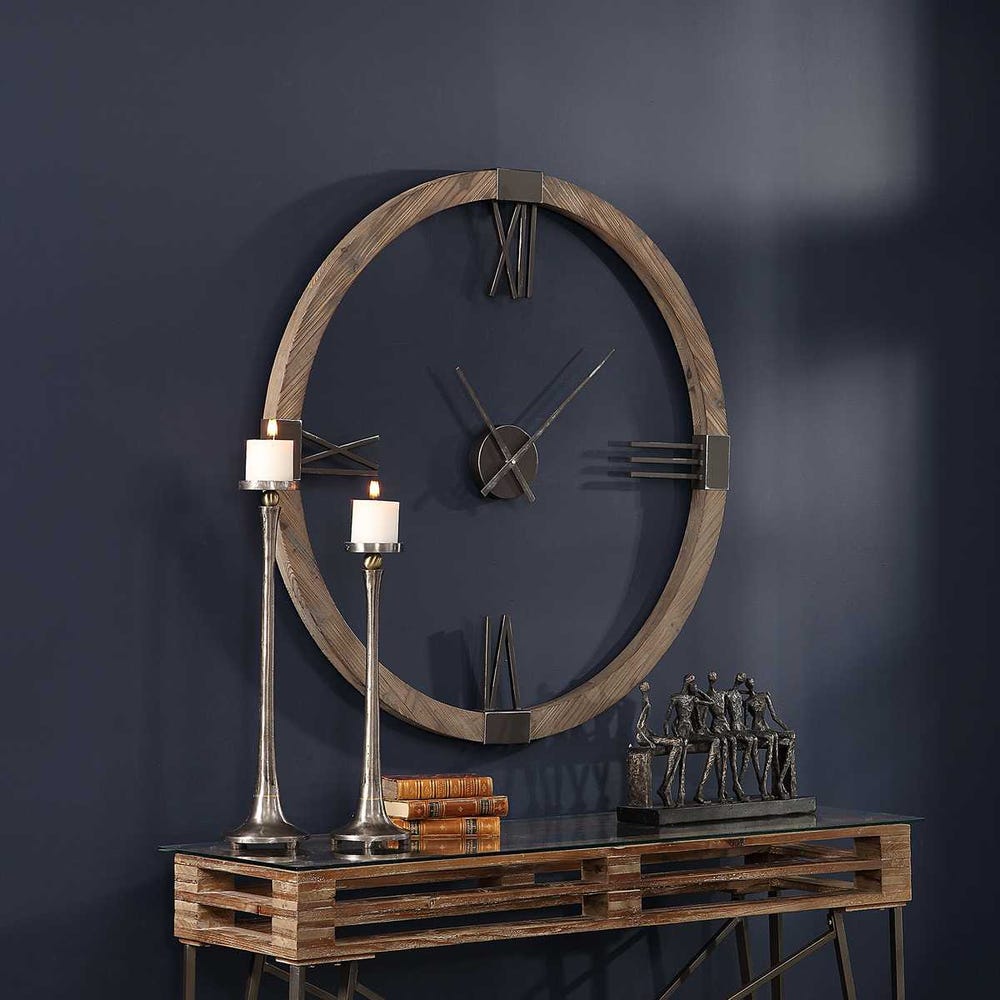 Natural stained, fir wood clock frame with hand forged, aged iron Roman numerals and floating center dial. Quartz movement ensures accurate timekeeping. Requires one “AA” battery.