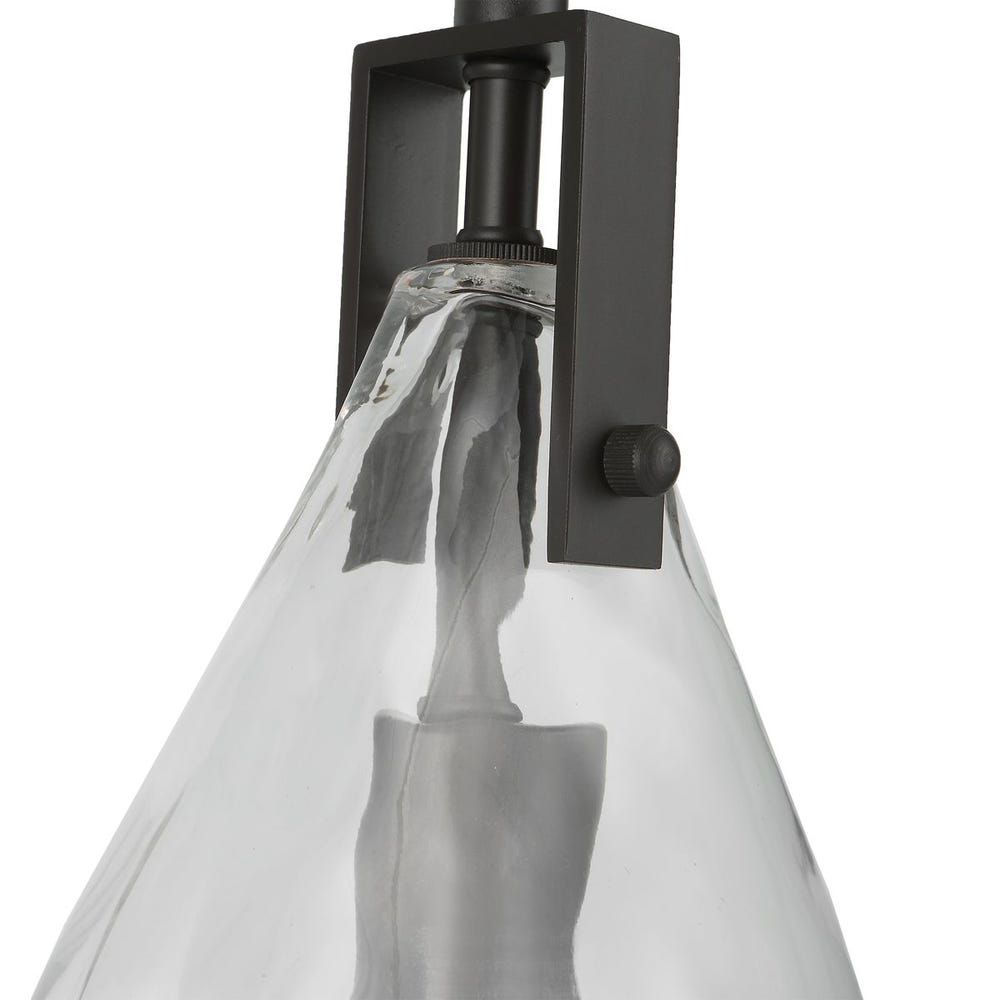 Transitional pendant in a matte black finish with a flat clear teardrop-shaped watered glass. From the front view, it is a teardrop shape and from the side, it is only 4″ wide and flat in appearance. 1-60 watt max Edison socket. Bulbs not included. Supplied with black 15′ cord and black canopy.