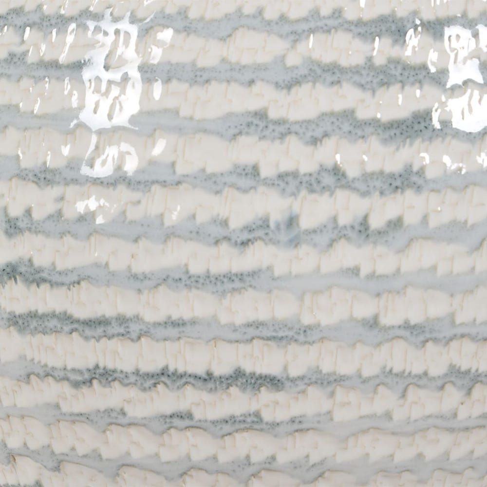 Featuring a textured, horizontally striped ceramic base in soothing white and gray tones, the Clary Table Lamp elegantly rests on a clear crystal foot, accented by antique brass plated details. A round hardback drum shade covered in crisp white linen fabric completes the look. Due to the nature of fired glazes on ceramic lamps, finishes will vary slightly.