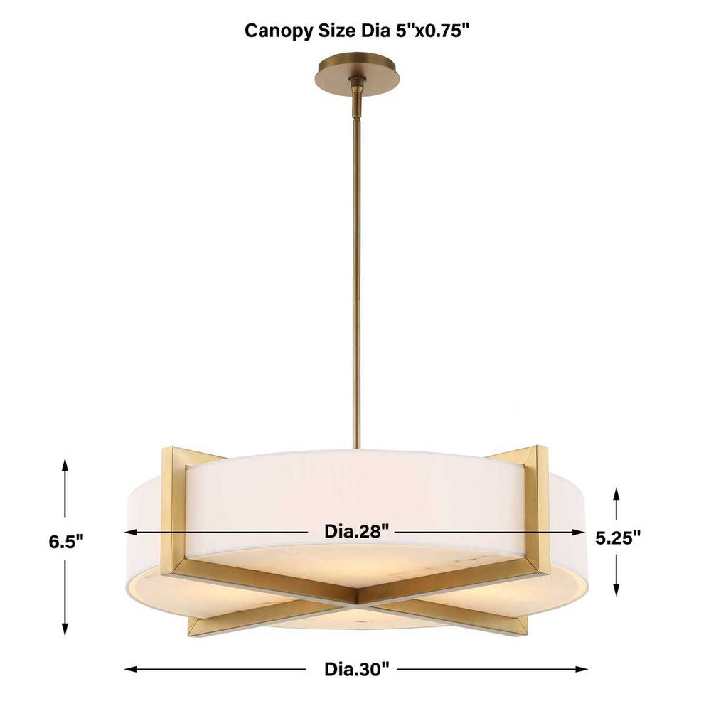 Hardback white linen hanging shade with architectural beam detail enhanced in a matte brushed brass finish with a lower faux alabaster diffuser. 4-60 watt max, Edison sockets. Bulbs not included. Supplied with 15′ wire, 3-12″ stems,and 1-6″ stem for adjustable installation also includes 1-3″ rod for semi-flush mounting option.