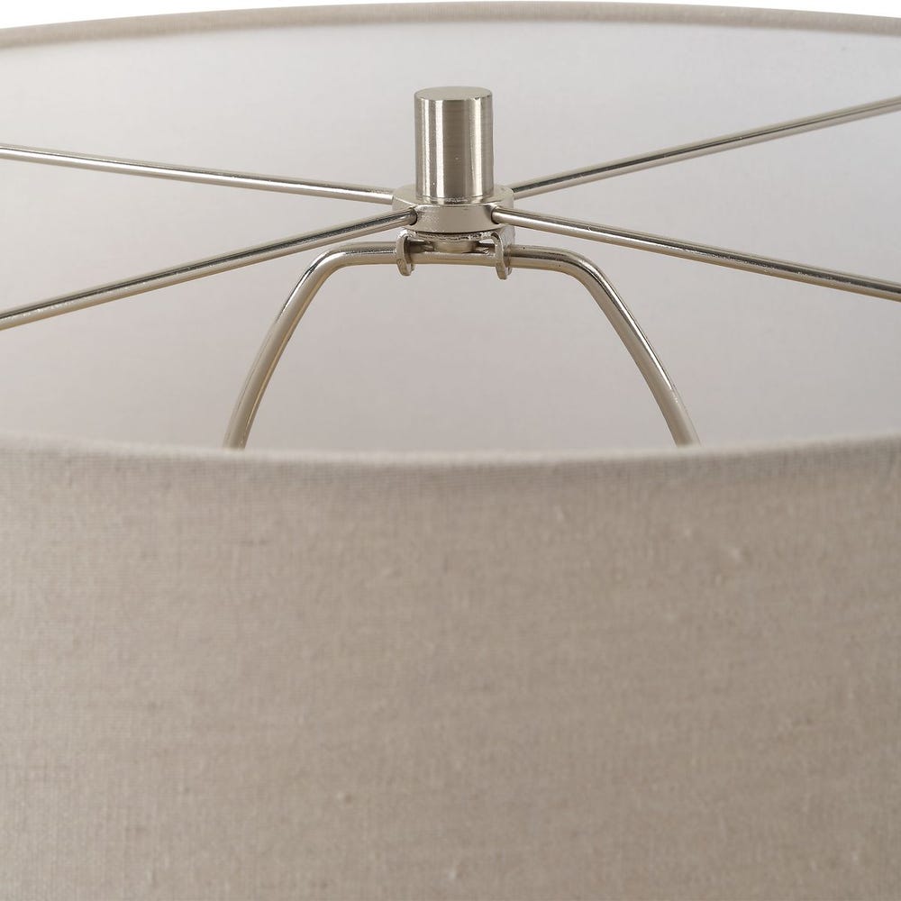 This ceramic table lamp boast a ribbed textured surface finished in a heavily distressed stone ivory with dark gray undertones. Accentuated by brushed nickel plated details, this lamp exudes rustic elegance and charm. The round hardback drum shade is a casual light beige linen fabric with natural slubbing.