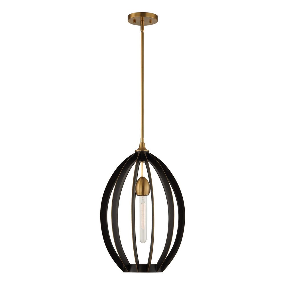 An architectural oval drop 1 Lt pendant of linear bands in dark bronze finish with warm brass accents. 1-60 watt max Edison socket our designer suggests a T type bulb. Bulbs not included. Supplied with 15′ wire, 3-12″ stems and 1-6″ stem for adjustable installation.