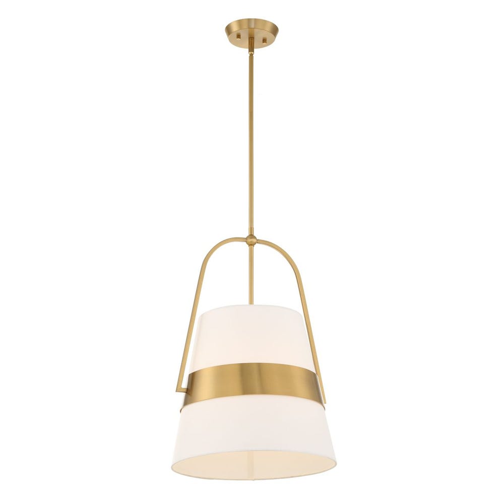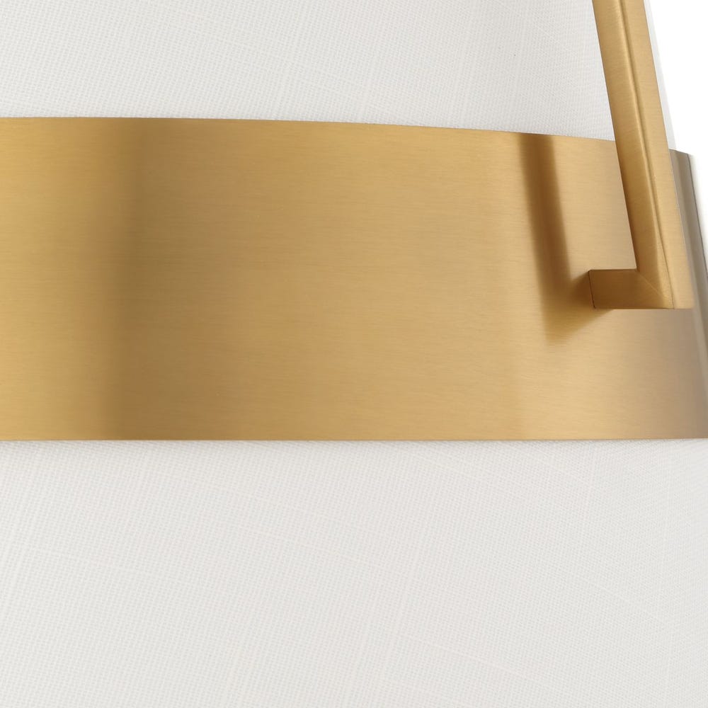 The traditional lines of the tapered white linen shade are enriched with the warm brass center support ring. 1-60 watt max Edison socket. Bulb not included. Supplied with 15′ wire, 3-12″ stems and 1-6″ stem for adjustable installation.