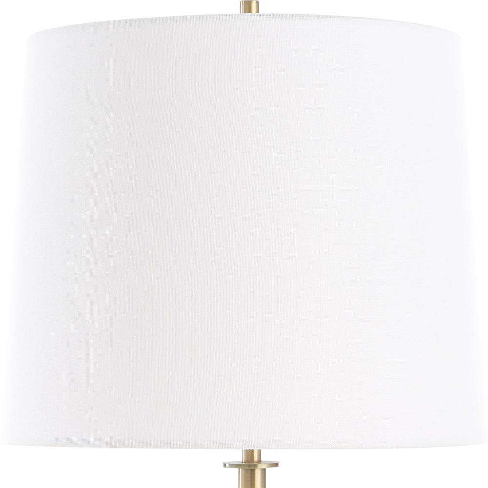 The Jenson Buffet Lamp showcases a striking black marble base with contrasting brown and white veining, complimented with a plated brushed brass base. The slightly tapered round hardback shade is a crisp white linen fabric.