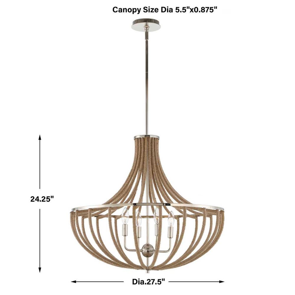 A classic empire shaped pendant in a polished nickel finish with a softening effect from natural twisted wrapped rope accenting the frame giving a warm casual effect. 4-60 watt max candelabra sockets. Bulbs not included. Supplied with 15′ wire, 3-12″ stems and 1-6″ stem for adjustable installation.