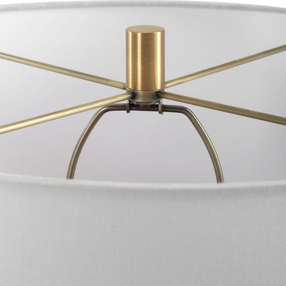Illuminate your space with this stunning table lamp, featuring an organically ribbed texture, finished in a glossy blue glaze with darker blue details, complemented by plated brass accents. Enhance any décor with its timeless elegance and warm ambiance. The round hardback drum shade is covered in a crisp white linen fabric. Due to the nature of fired glazes on ceramic lamps, finishes will vary slightly.