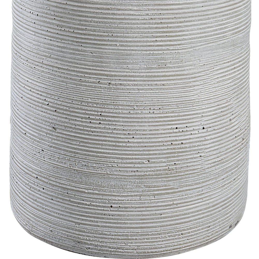 Handcrafted in an artisanal style, this table lamp is formed from ceramic in neutral off-white and gray tones with carved ring detailing. Steel accents are finished in a complementary brushed nickel. The hardback drum shade is covered in a white linen fabric.