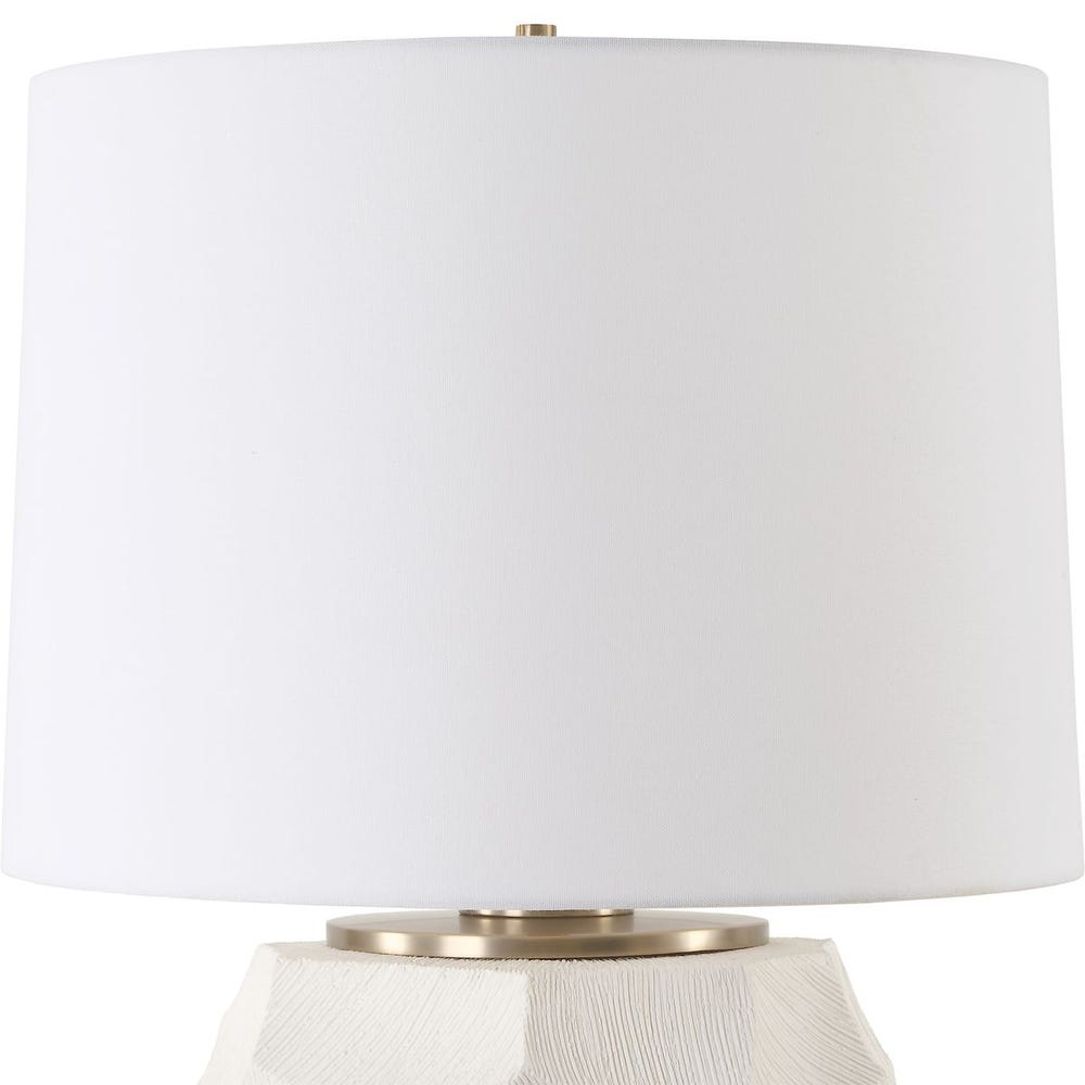 Featuring a chunky ceramic base with pronounced ribbed texture and sharply faceted edges. Finished in a subtle chalk white glaze and accented with plated antique brass details. A slightly tapered round shade made with a crisp white linen fabric completes the piece.