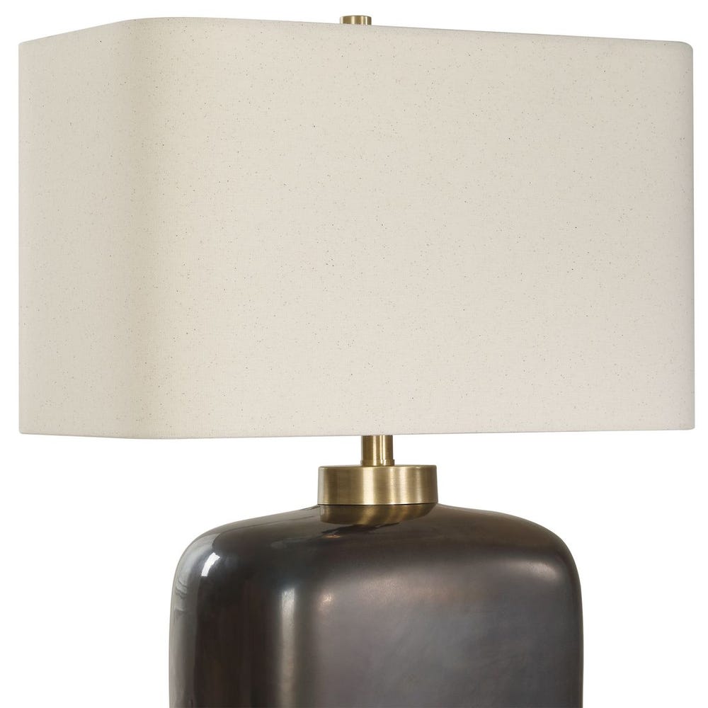 A vintage-inspired beauty, the Quentin Table Lamp has a metallic, dark bronze finish with crackled detailing on ceramic, paired with brass plated accents. The rectangular shade with rounded corners is covered in a white linen fabric with natural slubbing.
