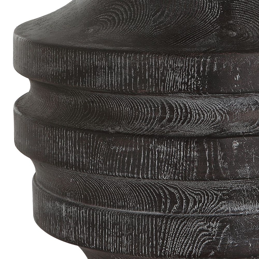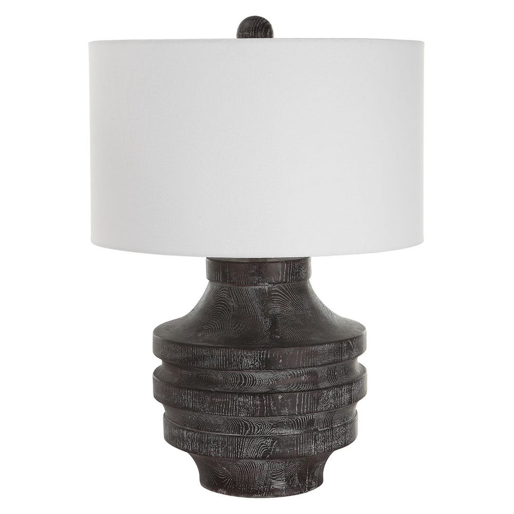 The Timber Table Lamp offers a touch of rustic charm with a carved wood look in a transparent black stain with warm undertones and a light white glaze accentuating the faux wood grain. The hardback drum shade is covered in a white cotton fabric.