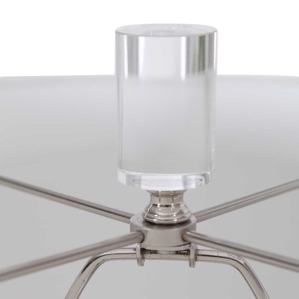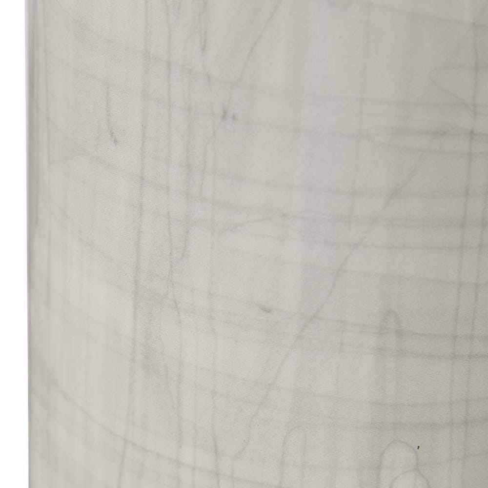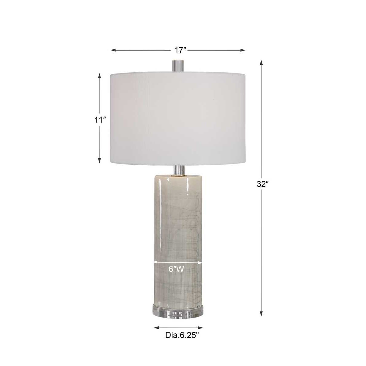 Modern in design, this ceramic table lamp showcases a neutral beige glaze with an abstract gray drip pattern, paired with elegant crystal details and polished nickel plated accents. The hardback drum shade is a white linen fabric.