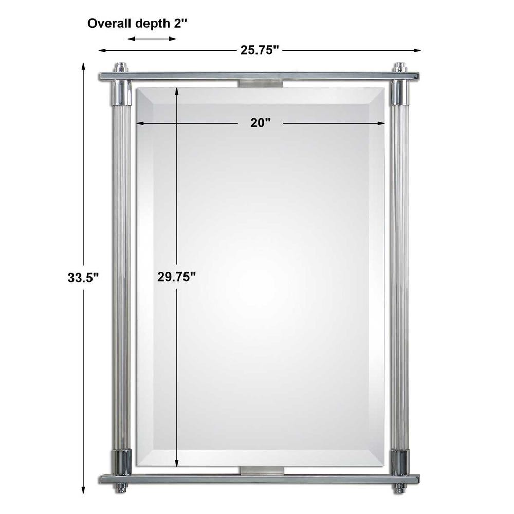 Ribbed glass columns accented with polished chrome plated details. Mirror features a generous 1 1/4″ bevel and may be hung horizontal or vertical.