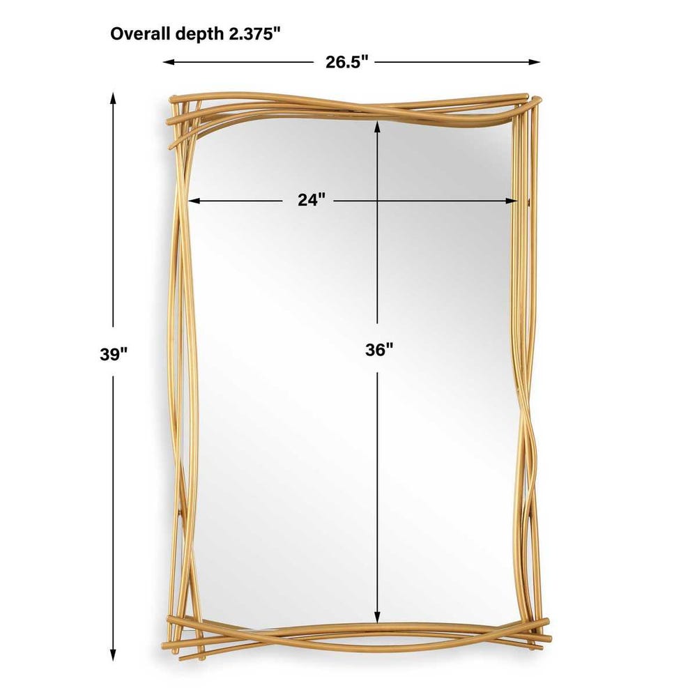 This unique mirror features a captivating frame crafted from hand forged iron with an organic, layered motif, finished in a lightly antiqued gold leaf. May be hung horizontal or vertical.