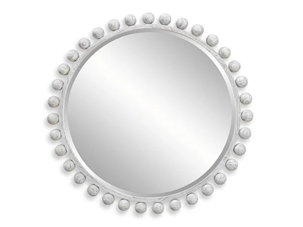 The Cyra Wood round mirror adds an upscale look and sophisticated style to any room by showcasing solid mahogany wood spheres that embellish a sleek inner frame, finished in a warm Walnut stain. Mirror has a generous 1 1/4″ bevel.