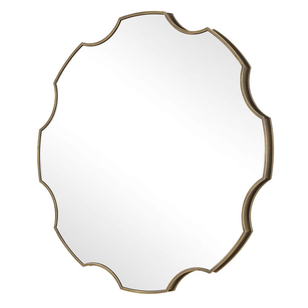 Our gear-shaped mirror boast an iron frame with a channeled side and a richly antiqued golden bronze finish. Its distinctive silhouette encases a floating polished edged mirror, creating a blend of vintage charm with modern allure.